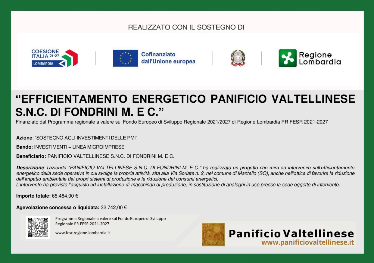 Il Panificio Valtellinese di Fondrini Gianantonio è una impresa specializzata nella produzione artigianale di prodotti da forno, tra cui il pane di segale e la rinomata bisciola valtellinese. La passione per il pane e per la Valtellina hanno fatto si che le tradizioni per le i prodotti genuini oggi possono essere sfornati ancora dai forni del panificio valtellinese. PANE VALTELLINESE del panificio valtellinese. BISCIOLA VALTELLINESE l’originale dolce tipico della Valtellina, prodotto sfornato e venduto dal PANIFICIO VALTELLINESE.